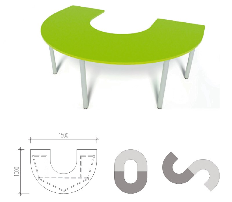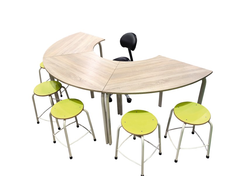 Deze hoefijzervormige instructietafel biedt de kans om in kleine groepjes te werken. Er zijn 4 zitplaatsen aan de buitenzijde. Ook als docententafel is deze tutortafel uitermate geschikt. Voorzien van een krasbestendig HPL blad en ronde metalen poten diameter 40 mm. Ook leverbaar op kleuterhoogte en met wielen.