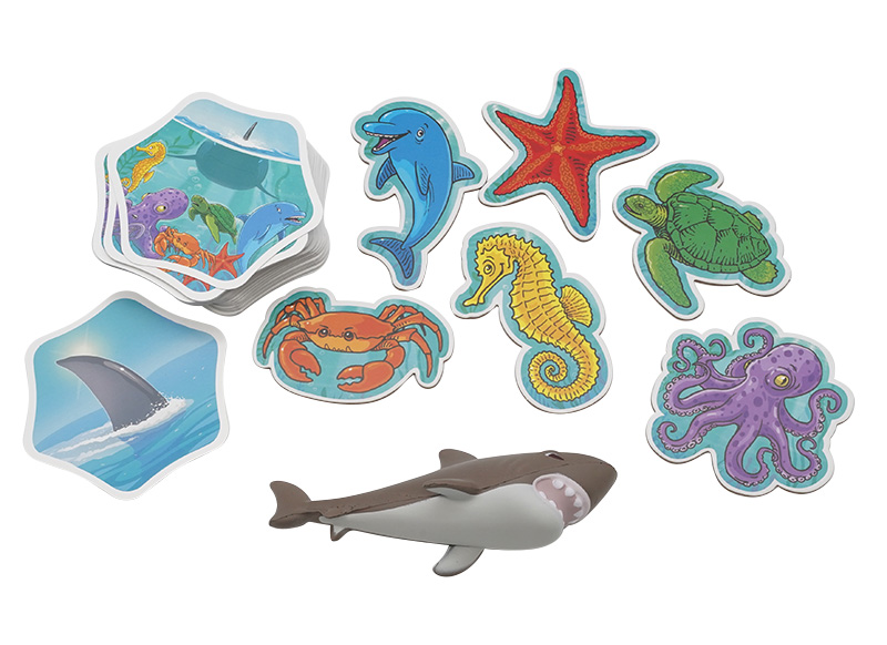 | Samenstelling | 72 speelkaarten, 12 haai-kaarten, 6 zeedier-kaarten, 1 haai en spelregels. |