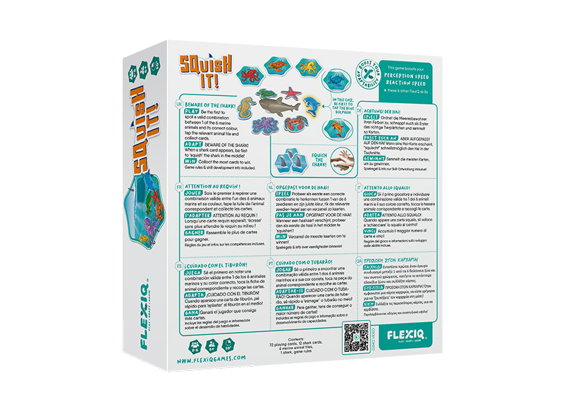 Supersnel reactiespel met zeedieren – voor iedereen die houdt van snelheid, kleur en een tikkeltje chaos! In dit kleurrijke spel draaien spelers om beurten kaarten om waarop verschillende zeedieren staan afgebeeld in allerlei kleuren. Het is aan jou om bliksemsnel de juiste combinatie tussen dier en z’n echte kleur te spotten. Wie het eerst op de juiste tegel tikt, wint de kaart! Maar let op: komt er een haaikaart boven? Dan moeten alle spelers tegelijk reageren! Snel de haai “squishen” is de boodschap – de snelste piraat wint de haaikaart, de traagste moet er eentje afstaan. Dit spel stimuleert visuele discriminatie, kleurherkenning, reactiesnelheid en concentratie. Het zorgt voor spanning, hilariteit én een gezonde dosis competitie. Dankzij het eenvoudige concept en de speelse thematiek is het perfect inzetbaar voor korte spelmomenten. Eens alle kaarten gespeeld zijn, wint wie de meeste kaarten heeft verzameld. Een vrolijk en leerzaam spel dat keer op keer voor plezier zorgt! |